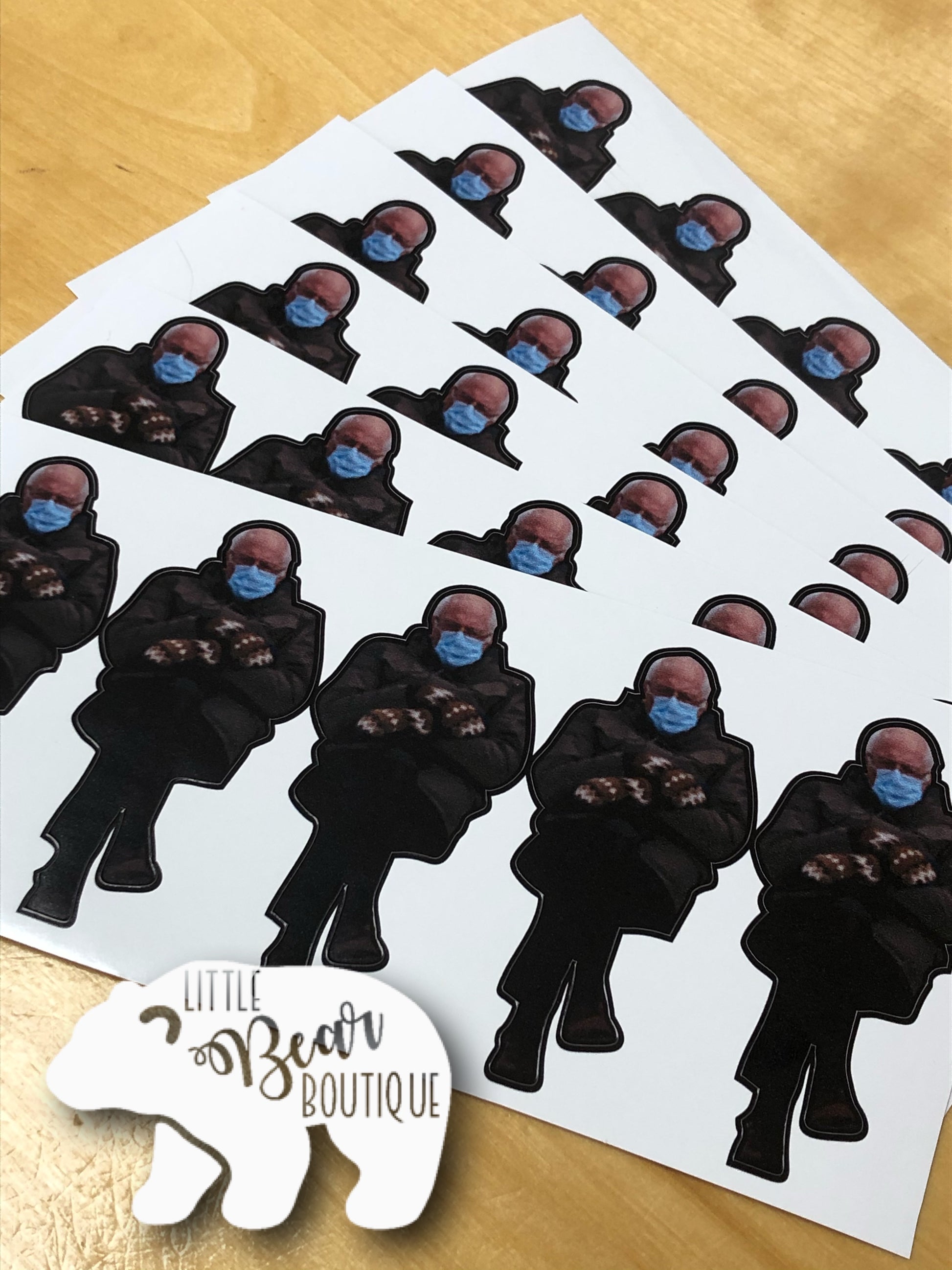 A strip of five 3.25” tall Bernie Sanders decals. Put Bernie anywhere! He would go great on a Hydroflask or laptop, or even out in the wild! Decals are printed on waterproof, permanent vinyl, so he can go pretty much anywhere! A portion of sales goes to support Meals on Wheels.