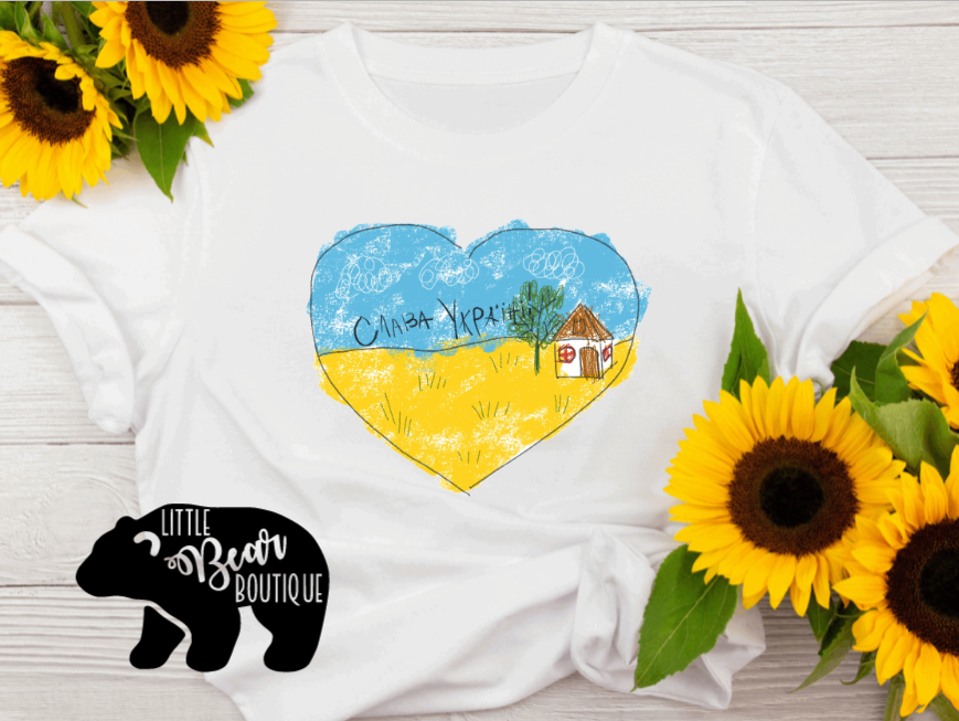 Soft shirt with a sweet drawing by a Ukrainian child (Irina). The words say "Glory to Ukraine."  Proceeds benefit Ukrainian relief efforts (Razom for Ukraine, Sunflower of Peace, and Voices of Children Foundation).